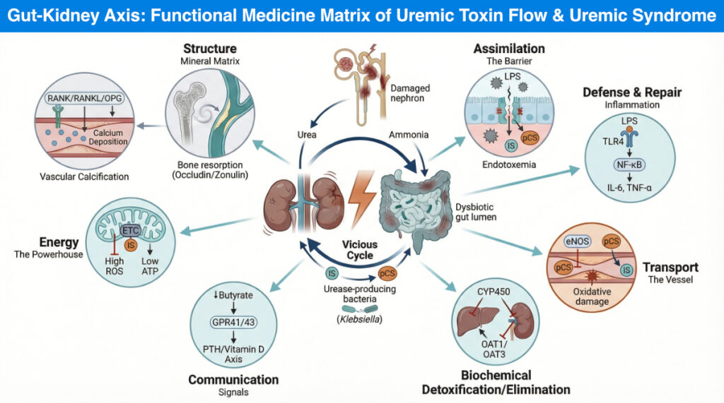 When we apply this systems-biology lens to Chronic Kidney Disease (CKD), we stop seeing the kidney as a failing filter in a vacuum. Instead, we begin to uncover a “toxic dialogue” between the gut and the kidneys, where imbalances in the microbiome (dysbiosis) trigger a cascade of inflammation and metabolic gridlock that impacts every node of the matrix. This approach allows us to move from simply managing a diagnosis to addressing the systemic root causes of the disease.