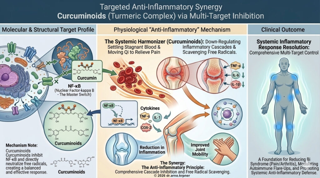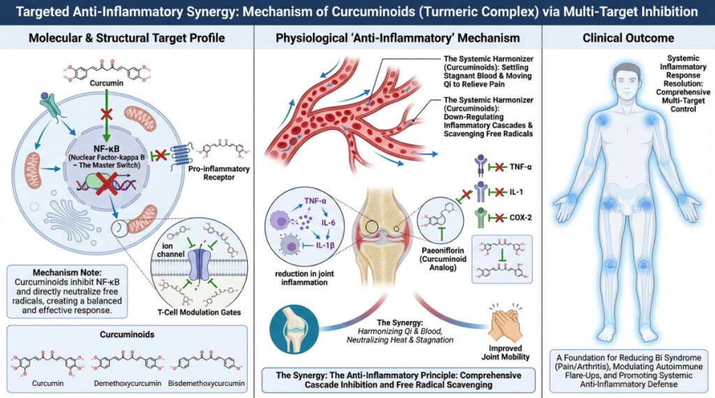 From a modern physiological perspective, curcumin acts as a multi-target molecule. Unlike synthetic NSAIDs (Non-Steroidal Anti-Inflammatory Drugs) which primarily inhibit the COX-2 enzyme, curcumin modulates the inflammatory response “upstream.”